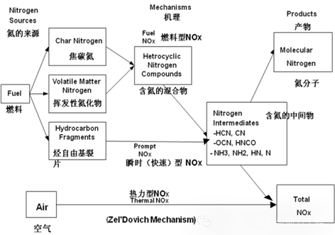 NOx的生成機(jī)理分為熱力型NOx和燃料型NOx。